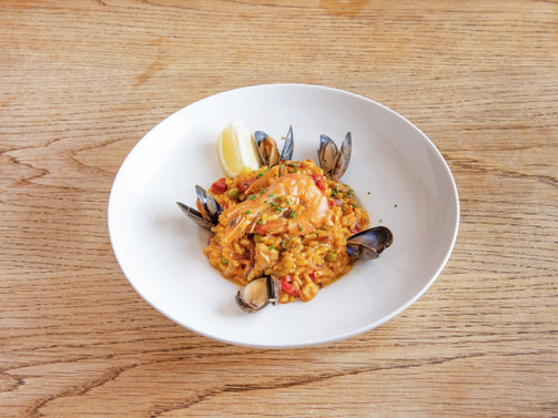 Spanish chorizo, chicken strips, squid, mussels, prawns, mix peppers, onion, peas, paella rice, red wine, herbs, saffron, touch of garlic and chilli.