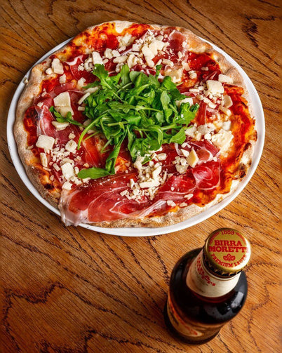 Pizza sauce, buffalo mozzarella, parma ham, rocket leaves and parmesan shavings