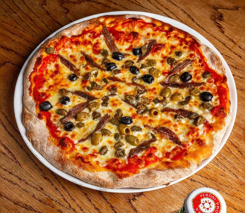 Tomato Pizza Sauce, Mozzarella, Tuna, Anchovies, Olives, Caramelized Red Onion, Rocket. Contains Gluten and Dairy.